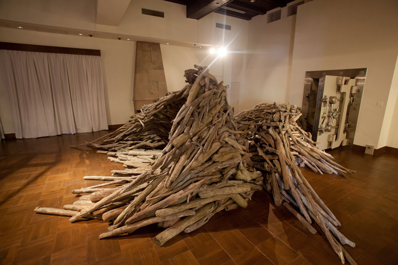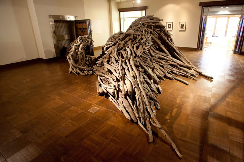 Fields, rice fields and forests in my hometown were reclaimed and razed to build an industrial complex. A professional described that ‘Nature is practically nought for the government. In other words, Nature is unprofitable and unvaluable. ‘ In the economically centered modern society, is the Nature not necessary at all? Driftwood is the symbol of the dynamic natural circulation such as rain falls on the mountains,it forms river into the sea, and water vapor moulds cloud to rain on the mountain…. This cycle gives not only new lives and harvest, but also it has asperity of claiming lives. Human being is a part of the natural circulation and living in it. When I create driftwood work, I always look at wood carefully one by one to choose the strongest line, which indicates the direction the wood lived. And I connect them to make a form. This is like a fight or conforms between my whole ideal form and the unique line of the driftwood. It is the time to listen the voice of driftwood and confront nature of nature. If the vault door indicates monetary society, driftwood is the antithetical symbol of Nature. It is your choice to see this work as the confliction or microcosm of the city and Nature.