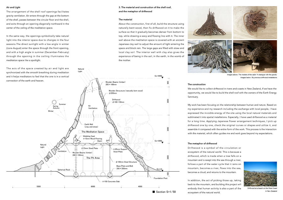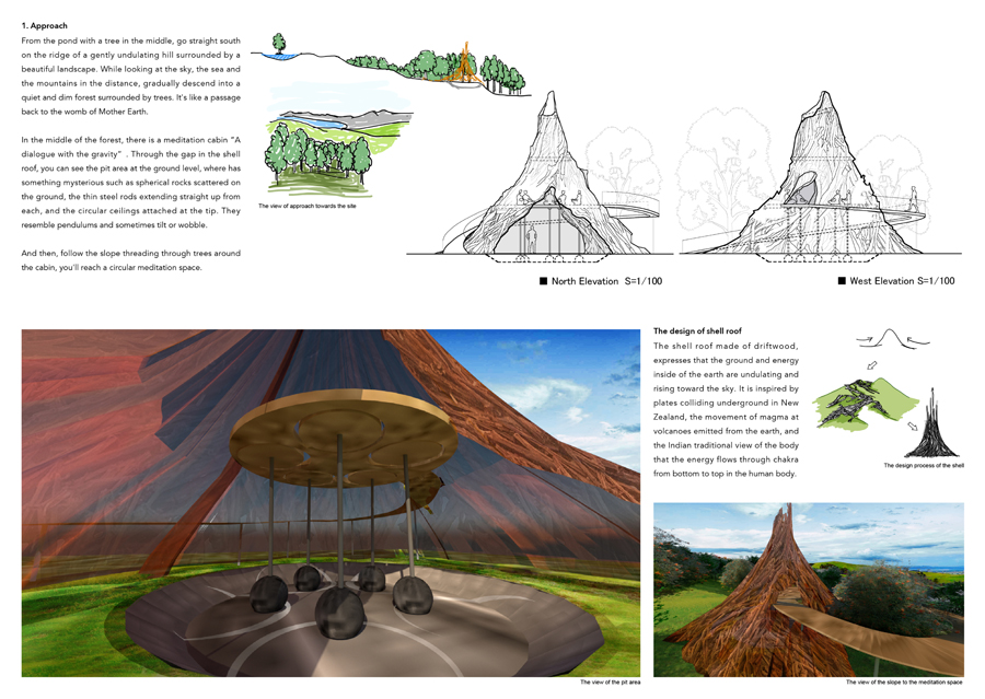 ニュージーランドに瞑想キャビンを作る計画。森の中を抜けると、まるで地面が隆起し、地球内部のエネルギーが空に向かって登っていく様を表したようなキャビンが見えてくる。キャビンの周囲を巡る緩やかなスロープを登り、瞑想キャビンの内部へと入る。キャビンの床には、5つの円形状に切り抜かれた「揺れる座面」が組み込まれている。座面は地面へと伸びる1本のスチールによって支えられ、地面との接点には球体の岩が取り付けられており、あえて不安定に揺れる構造になっている。瞑想者は座面中央で座禅を組み、地球の中心へとまっすぐに向かう重力の垂線をイメージし、自らの 重心軸をそこに沿わせるように意識しながら背筋を伸ばして座ることにより、座面を安定させることができる。まさに地球との一体感を感じながら、瞑想を始めることができる。 This is an architectural plan to build a meditation cabin in New Zealand. When you pass through the forest, you will see the meditation cabin as if the ground is uplifted and the energy inside the earth is uplifing to the sky.If you go on the gentle slope around the cabin, you can enter the meditation cabin. On the floor, the five circular seats called "wobbling seats" is incorporated.The seat is supported by a single piece of steel that extends to the ground, and a spherical rock is attached to the point of contact with the ground that aim to shake unstably. The meditator need to form zazen in the center of the wobbling seat and imagin a vertical line of gravity that goes straight to the center of the earth and consciously make straight their back to along the line to make the seat stable. Feeling a sense of oneness with the earth, they can start their meditation.